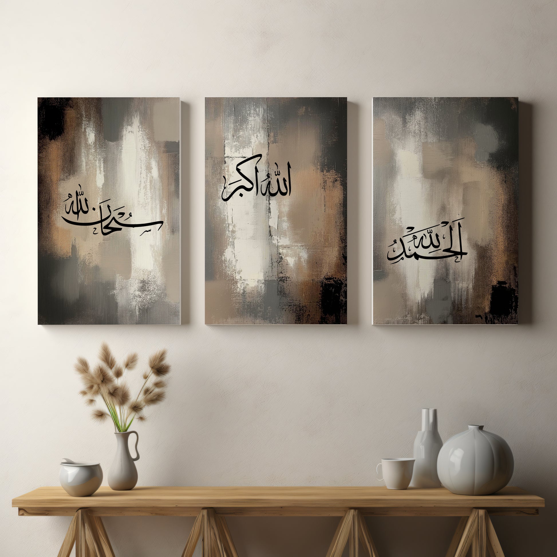 Set of 3 Beige & Black Arabic Calligraphy Canvases ✨ A stunning trio featuring SubhanAllah, Alhamdulillah, and Allahu Akbar in elegant Arabic calligraphy. Designed with a modern beige and black aesthetic, these premium fade-resistant canvases add a spiritual and sophisticated touch to any space. Perfect for home decor or as a meaningful gift